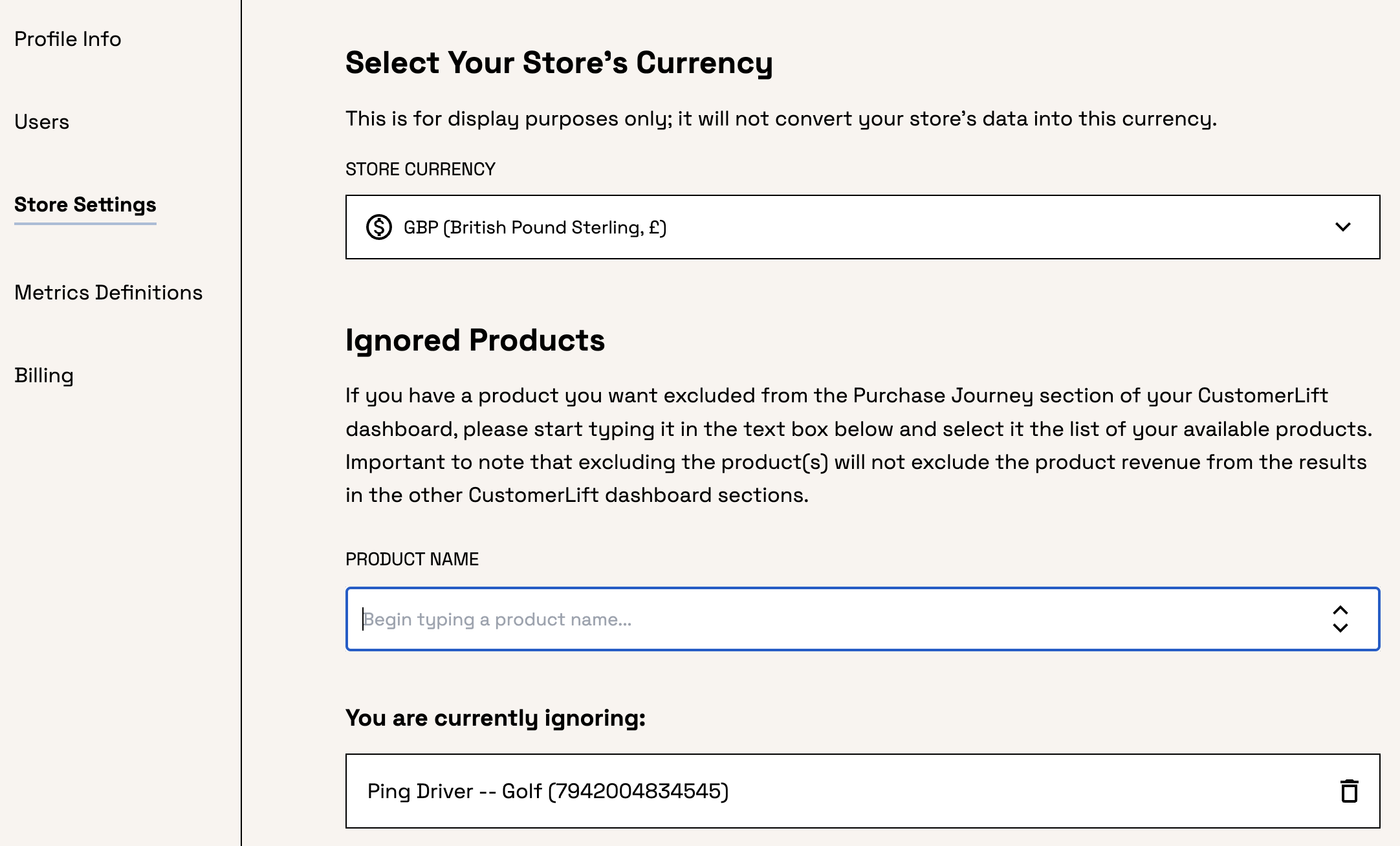 Store settings allow user's to ignore certain products in the dashboard results, and to select their store's currency.
