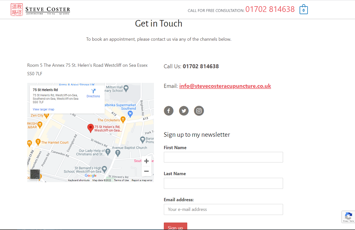 The get in touch section takes advantage of Google maps by embedding the location of Steve’s practice in the page. Links to his social media, and newsletter signup form make it easy to find and contact Steve, whatever the user’s preferred method. RECAPTCHA is used on forms to add extra security, by preventing unwanted protects the signup form from unwanted signups, such as bots.